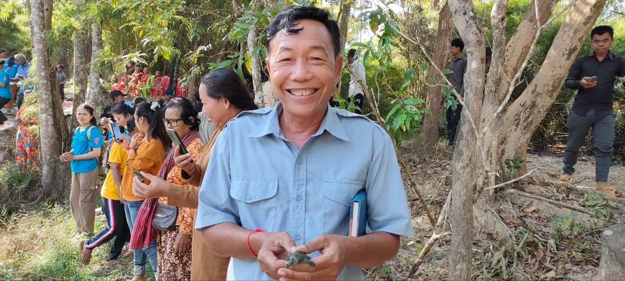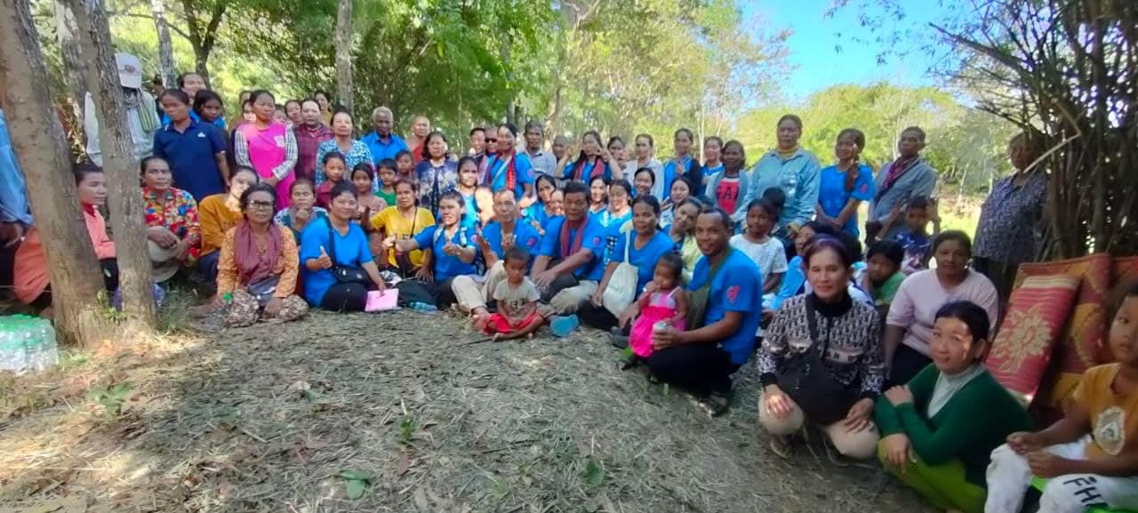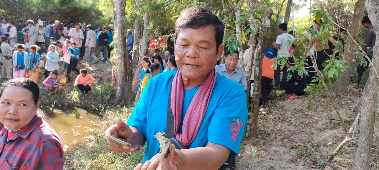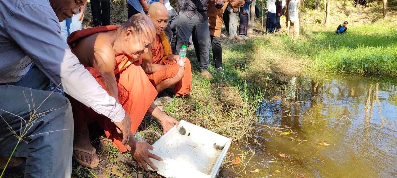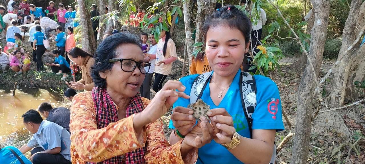 On December 14, 2023, Peace Bridges Organization, and women and men leaders from natural resources protection communities in collaboration with the monks of Srah Khchao pagoda, released 120 baby turtles into a conservation pond on the ridge of Srah Khchao mountain. This is the celebration of Peacebuilders Alliance Meeting for #CEEJA women leaders from cohort 1 to 4 and men leaders. The topic of the meeting is on “Gender and protection of natural resources.” There were 90 participants (65 women), including representatives from the #CEEJA project from Prey Lang, Preahrokar Forest Community Networks, Monk Community Forest, monks from the local Pagoda, police chief, village chief and villagers from O’Kaki village, Chreab commune, Santuk district, Kampong Thom province.